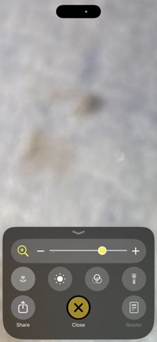 The provided image is too blurry to discern any specific insect features. It appears to be a screenshot of a camera interface looking at a vague surface, but no subject is in focus.