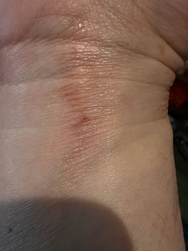 No insect is visible in this image to provide a specific identification. The image shows a skin irritation on a human wrist. This could be caused by many different insects or non-insect sources like contact dermatitis. If you are experiencing symptoms such as pain, swelling, or spreading redness, please consult a healthcare professional for an accurate diagnosis.