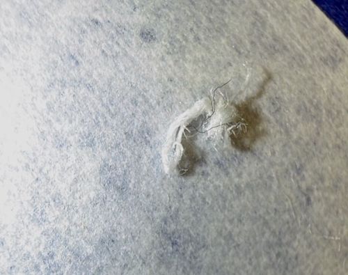 No physical risk from the object itself as it is harmless debris (cotton, polyester, skin flakes). The primary risk is misdiagnosis of a medical or psychological condition where the patient believes these fibers are living parasites.
