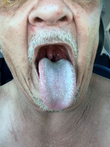 The image depicts a person's open mouth and tongue. No insect or bug is visible in the provided image.