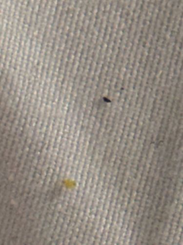 Size: 1 to 7 millimeters; the dark object appears to be a nymph or adult, while the yellow object may be an instar nymph or egg.