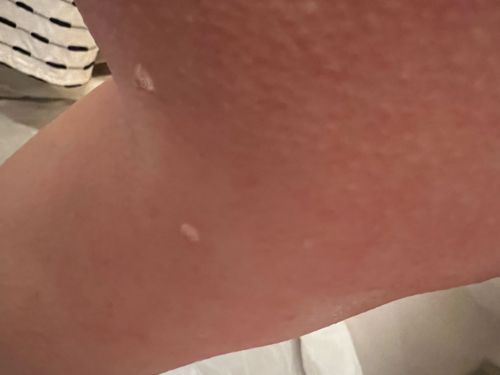 It is not possible to identify an insect from this image. The image appears to show human skin with small, raised, light-colored marks or lesions. If you are concerned about a skin condition or potential insect bites, please consult a healthcare professional for an accurate diagnosis and treatment plan.