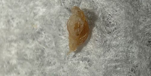 This object is inanimate. It does not display biological behavior. The irregular shape, translucency, and amber color often lead people to mistake it for a bed bug skin, a desiccated larvae, or an egg casing, but it lacks distinct insect segmentation, legs, or antennae.