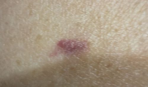 The image provided does not show a bug or insect. It appears to be a close-up photograph of human skin featuring a reddish-purple mark, which could be a bruise, birthmark (hemangioma), or skin lesion. If you are concerned about this mark, please consult a medical professional.