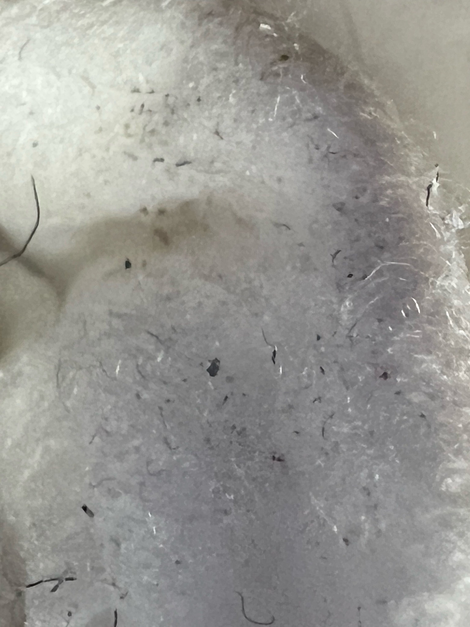 The image shows stationary, irregularly shaped dark particles and thin filaments tangled in a fibrous material. These lack the anatomical structure (segments, legs, antennae) of insects.