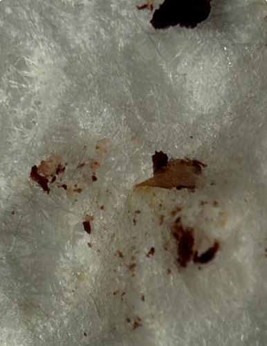 The image provided does not show an intact insect but rather small, reddish-brown stains or debris on a fibrous surface (likely fabric or paper). While it is impossible to identify a specific insect from this image alone, these types of rusty or reddish stains are sometimes associated with crushed bed bugs or bed bug fecal spots found on bedding.