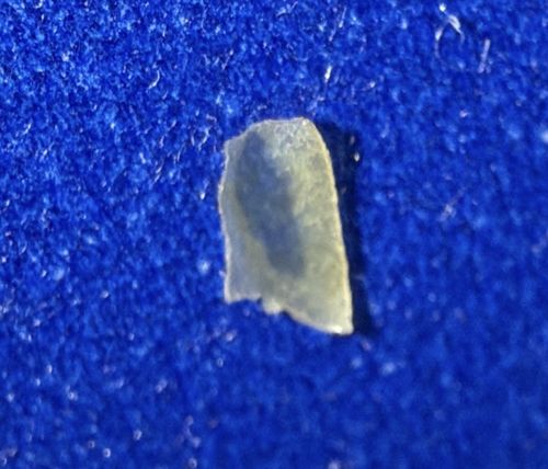 Stationary; no biological activity. This appears to be a flake of inanimate material, such as dried skin, a paint chip, a piece of plastic, or a fingernail fragment, rather than a biological organism.