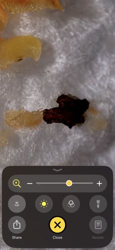 The object in the image does not exhibit biological features (such as legs, antennae, or segmented body) characteristic of an insect or bug. It appears to be a piece of debris, organic matter (like a crumb or dried plant material), or household lint.
