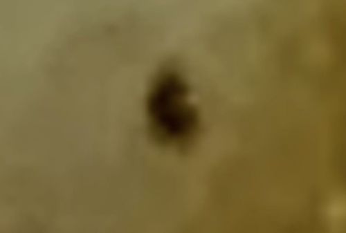 The image provided is too blurry to identify any insect, arachnid, or organism. It appears to be a dark smudge or spot on an unclear surface, lacking discernible features such as legs, wings, or body shape needed for identification.
