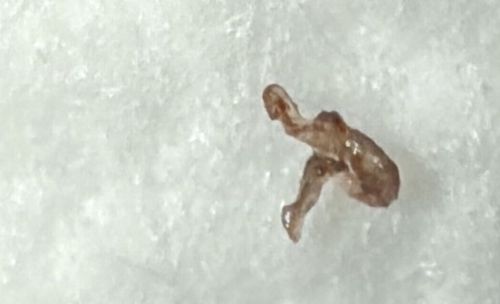 This object is inanimate. It does not move, feed, or reproduce. It appears to be a piece of dried skin, mucus, earwax, scab material, or lint.