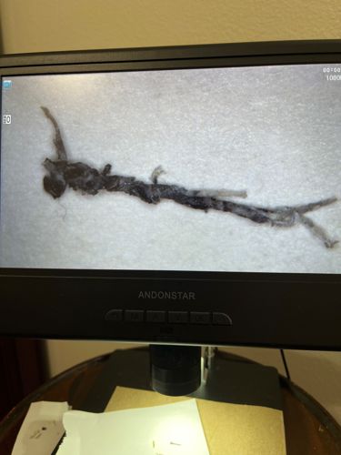 This object lacks the anatomical hallmarks of an insect, such as segmented legs, a distinct head, thorax, abdomen, or antennae. It appears to be a tangled collection of fibers and debris.