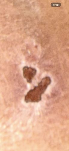 The image appears to represent a skin lesion or mole. If this is a new or changing mark on your skin, it may pose a health risk. You are strongly advised to consult a medical professional or dermatologist for an evaluation, as irregular skin marks can sometimes be signs of more serious conditions.