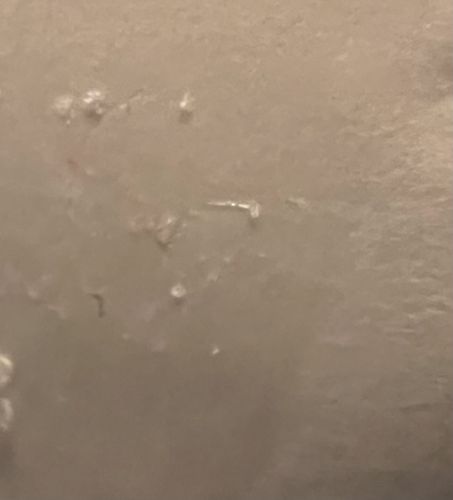 The image is too blurry for a definitive identification of an insect. The objects shown lack clear anatomical features like legs, antennae, or segments and closely resemble household lint, skin flakes, or dust.