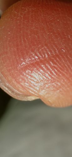 There is no insect in this image. The image displays a close-up of a human fingertip with what appears to be a small indentation or imprint on the skin ridges, possibly from pressing against a textured surface.