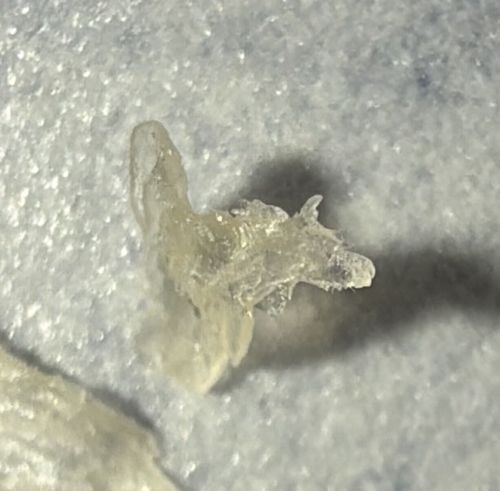 Hmless. This appears to be non-biological debris, possibly dried nasal mucus, a flake of dried glue or gel, or a solidified skin secretion, rather than a living organism.