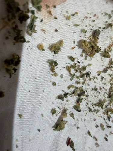 The image appears to show dried plant material (likely herbs or botanical matter) and debris on a white fabric surface.