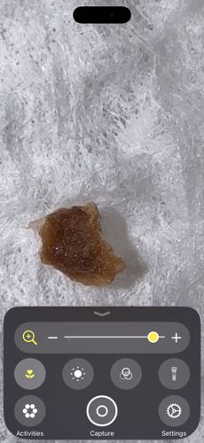 The image appears to show a piece of organic debris, caramelized sugar, or an environmental material on a fibrous surface such as a tissue or paper towel.