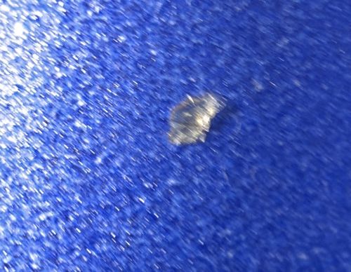 This is inanimate debris, likely a flake of dry skin (dandruff) or a small scab. It does not exhibit behavior.