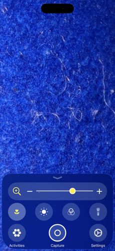 The image shows blue textile or fabric fibers under magnification.