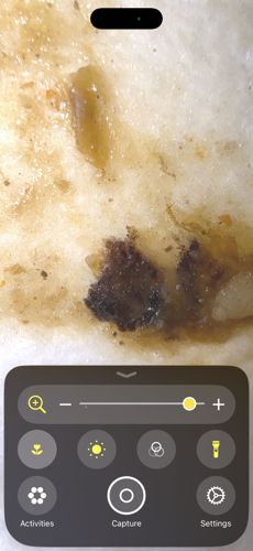 This image does not contain a discernible insect or bug. It appears to be a magnified photo of organic debris, food residue, or biological discharge on a white surface. If this is a sample related to a medical concern, please consult a healthcare professional. If it is related to a pest issue, a clearer photo of a dry, intact specimen would be needed for identification.