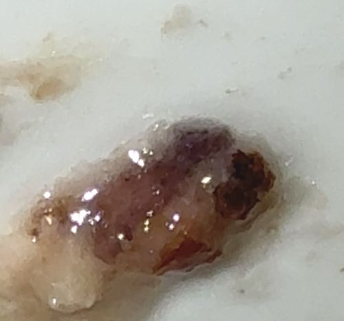 The object in the image does not appear to be an insect, arachnid, or living organism. It resembles a small piece of organic debris, a scab, congealed food matter (like jam or sauce), or perhaps a degraded piece of biological material resting in a wet or starchy substance. It lacks distinct morphological features such as legs, wings, antennae, or segmentation required for insect identification.