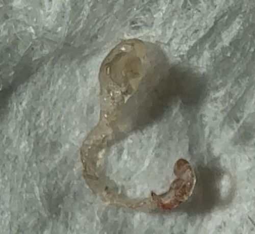 Larvae are negatively phototactic (they avoid light). Upon hatching, they burrow deep into carpet fibers or floor cracks to find food and moisture. This specimen appears to be curled, which is common when they desiccate (dry out) or die.