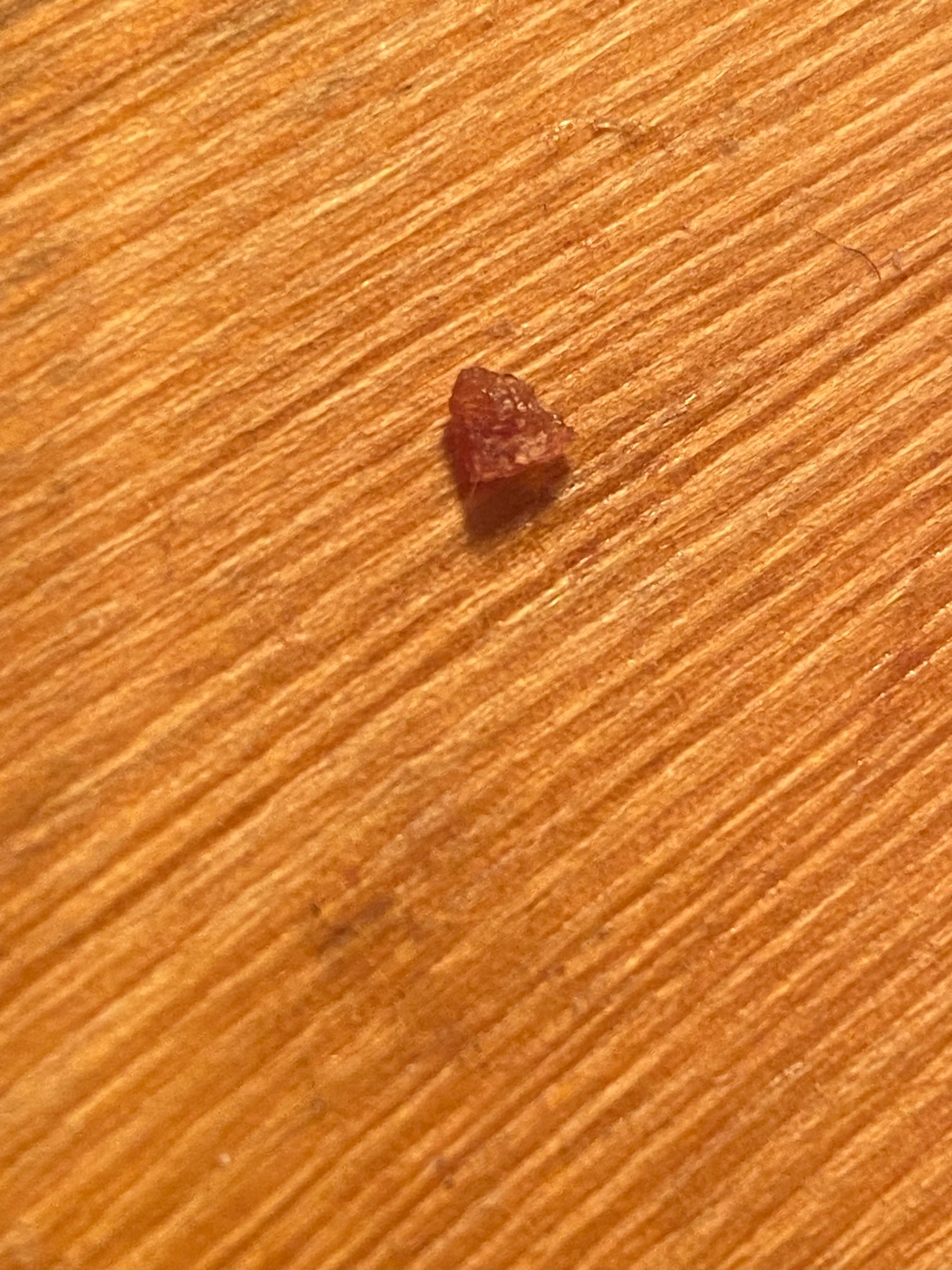 The object lacks characteristic biological features such as legs, antennae, or segmentation. It appears to be an inanimate fragment, possibly a crumb of food, crystalline substance, or house debris.