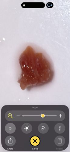 The image shows an amorphous, fleshy, or waxy mass without visible legs, wings, antennae, or segmental body parts typical of an insect.
