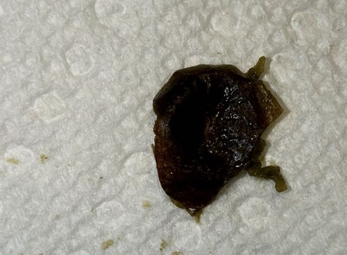 Adult females are immobile and attach themselves permanently to a plant surface, forming a protective, shell-like bump (as seen in the image). The greenish fragments at the edge are likely torn plant tissue from where the insect was attached.