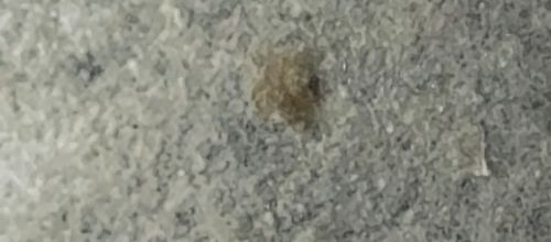 Due to the extremely low resolution and blurriness of the image, the subject cannot be positively identified as a living insect. It resembles a small stain, a piece of lint, or possibly a very out-of-focus small arachnid or beetle, but no specific identification is possible.