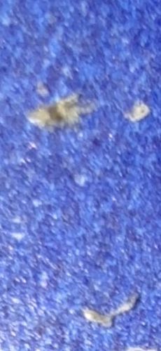 The image provided is too blurry and lacks sufficient detail to accurately identify any specific bug or insect. It appears to be potential debris, lint, or an unrecognizable speck on a blue fabric surface.