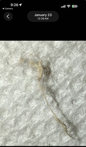 This object is inanimate. It appears to be a twisted thread, piece of lint, skin flake, or mucous strand rather than a living organism. Its shape is irregular and does not display the segmentation or appendages (legs, antennae) typical of insects or arachnids.