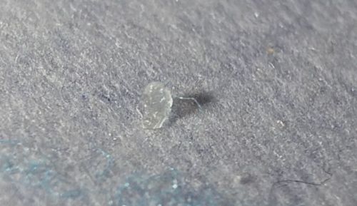 Size: Microscopic; adult females are 0.30–0.45 mm long and 0.25–0.35 mm wide; males are slightly smaller. (Note: The object in the image is visible to the naked eye, suggesting it might be a skin flake or debris often mistaken for a mite, or a magnification of a very small particle).