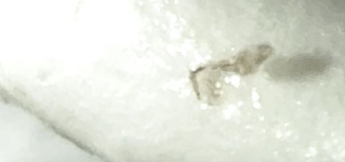 The provided image is too blurry and overexposed to make a positive identification. The dark shape against the light background looks somewhat like insect debris, a stain, or possibly a small larva, but no specific features (legs, antennae, wings, segmentation) are visible to classify it.