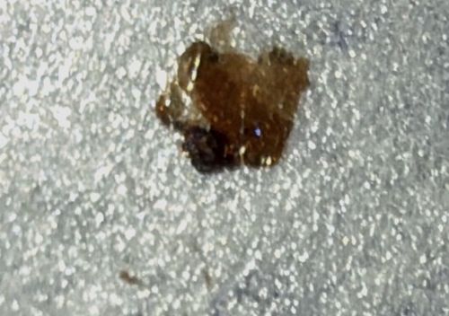 This object is inanimate. It appears to be a small piece of organic debris, potential candidates include a small scab, a flake of dried earwax (cerumen), or a piece of dried resin/sap. It lacks the symmetrical body parts (legs, antennae, segments) typical of insects.