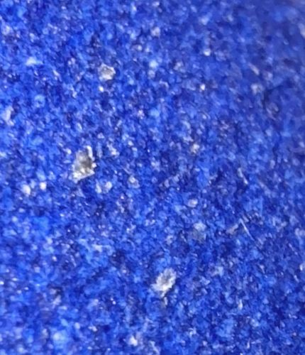 The provided image does not contain a visible bug or insect. The image appears to be a close-up texture, possibly of blue fabric, carpet, or a granular surface, with no distinguishing biological features to identify.