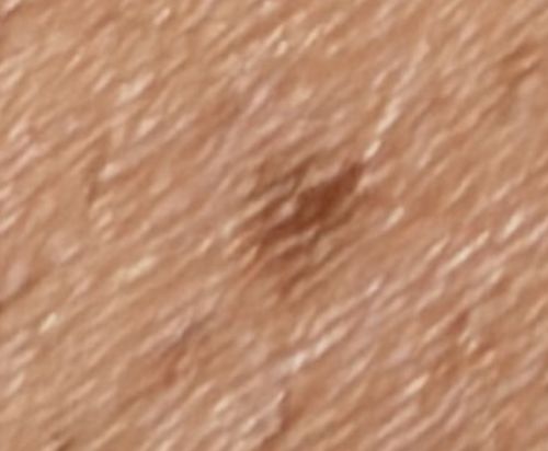 The image provided is extremely blurry and lacks sufficient detail to make a positive identification. The dark spot could be anything from a mole, a speck of dirt, a scab, or potentially a small insect, but no distinct morphological features are visible.
