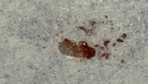 The image provided does not show a living or intact insect. It appears to be a reddish-brown smear, stain, or the remains of a completely crushed insect (potentially something blood-filled like a bed bug, mosquito, or tick based on the color, but this is pure speculation without an intact specimen).