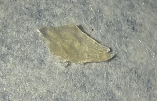 Does not exhibit behavior. This is an inanimate object, likely a piece of dried callus, dead skin, or perhaps a dried secretion or food crumb, often mistaken for bed bugs or insect casings due to its color and placement.