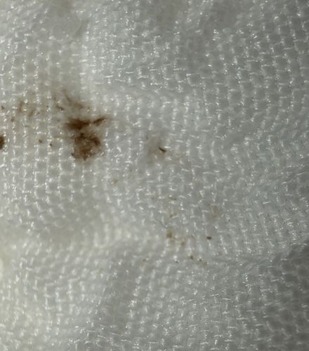 The image provided does not show a recognizable insect or arthropod. It appears to be a smudge, stain, lint, or particulate matter trapped in the weave of a fabric.