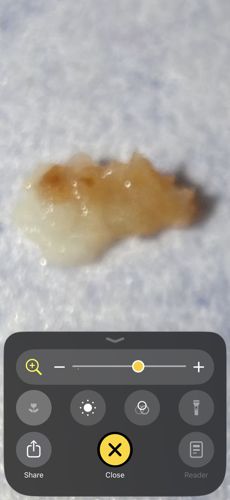 This object does not appear to be a bug or insect. It lacks any defining biological features of an arthropod and resembles a fragment of debris, dried organic matter, or crystalline build-up. Identifying physical symptoms or medical concerns should be handled by a healthcare professional.