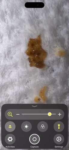 The substance appears amorphous, translucent, and amber-colored with a sticky or resinous texture and no discernible head, legs, or segments.
