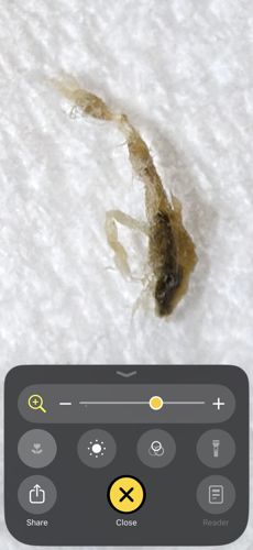 The image shows a highly degraded specimen on a textured white surface, such as a paper towel or tissue, often found in household environments where material has been collected.