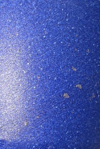 No insect or bug is visible in the provided image. The image appears to show a textured blue surface, possibly metallic paint or plastic, with small specks of debris or dust, but no identifiable biological organism.