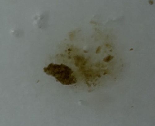 The image provided does not display the characteristics of an insect or arachnid. It appears to be a smudge, stain, residue (such as food or fecal matter), or crushed debris rather than an intact biological specimen with identifying features like legs, antennae, or segmentation.