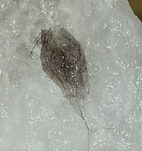 This object is inanimate. It does not move, eat, or reproduce. The fibrous appearance is caused by the tangling of hair, carpet fibers, or textile threads, often clumped together by static electricity or moisture.