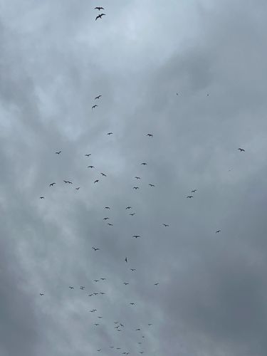Near freshwater sources such as ponds, lakes, rivers, and marshes; often seen flying over open fields or during migrations.