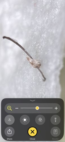 Human scalp and hair, specifically attached to individual hair shafts close to the scalp.