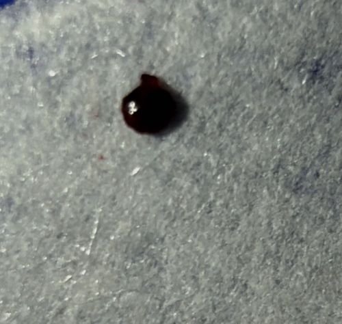 Size: Unfed nymphs are roughly poppy-seed sized (1-2mm); when fully engorged with blood (as pictured), they swell significantly to resemble a small bean or bead (3-5mm or larger).