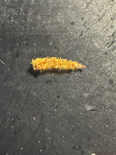 Keratin-rich animal products including wool, fur, feathers, silk, hair, and leather. This specific specimen appears to have constructed its case using orange fibers from a garment or carpet.